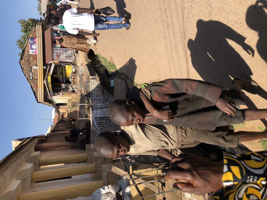 This image depicts a street scene in the city of Jos, Nigeria, under bright daylight. In the immediate foreground, two young African males, appearing approximately 7-12 years old, walk from left to right. The boy on the left wears a light-colored, soiled short-sleeved shirt and dark shorts. The boy on the right wears a dark, possibly striped or patched long-sleeved shirt and dark shorts, with his left arm around the left boy's shoulders. A partial view of an individual's arm and patterned garment is visible in the bottom left, indicating the photographer's presence. To the left, a building with yellow columns and a light-colored facade is partially visible. An older male in light-colored traditional attire is seated near this structure. An open drainage ditch with a metal grate runs parallel to the path, containing some refuse. Across this ditch, a weathered, single-story commercial building (shop) with a brown exterior and a corrugated metal roof is prominent, displaying various goods and advertisements. On the unpaved road to the right, a woman in a light-brown full-length garment and a male in a white t-shirt and blue jeans, carrying a black plastic bag, walk towards the background. The road continues uphill into the distance, flanked by additional simple structures and sparse vegetation, beneath a clear blue sky. Strong sunlight casts distinct shadows on the ground.