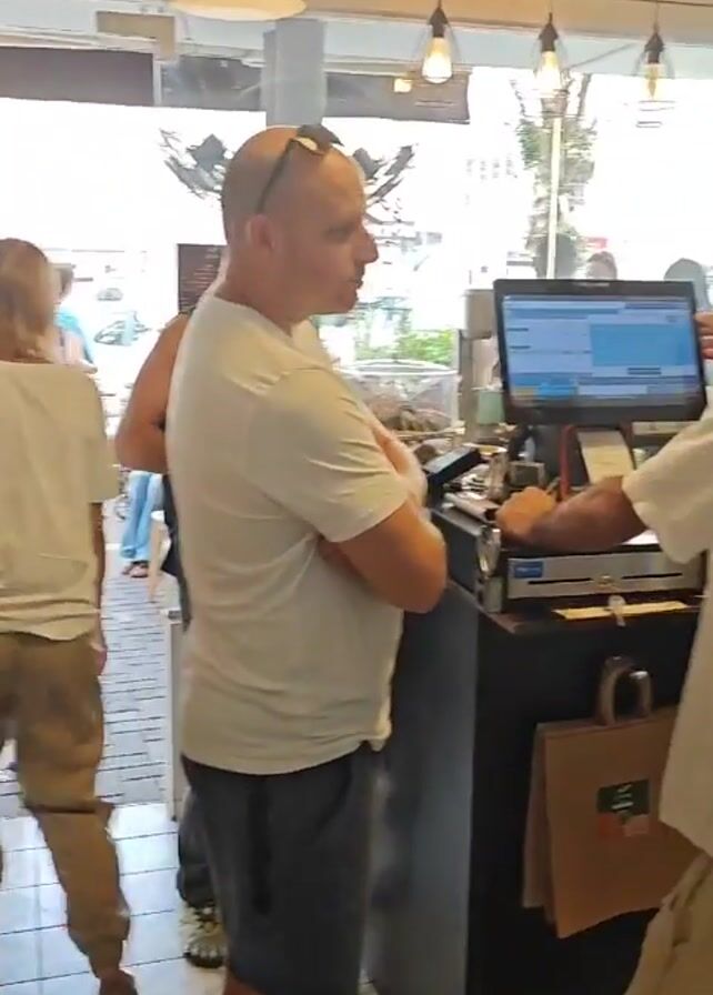 bustling scene inside a cafe. A group of people are waiting in line near the cashier counter, while employees are busy preparing and serving orders behind the counter. One employee uses a point-of-sale system, while another prepares a drink using an espresso machine. The cafe's interior is visible, with artwork and decorations on the walls, and a peek into the kitchen area shows additional employees working with cooking equipment. Personal touches like children's drawings and photographs are also visible on a refrigerator.