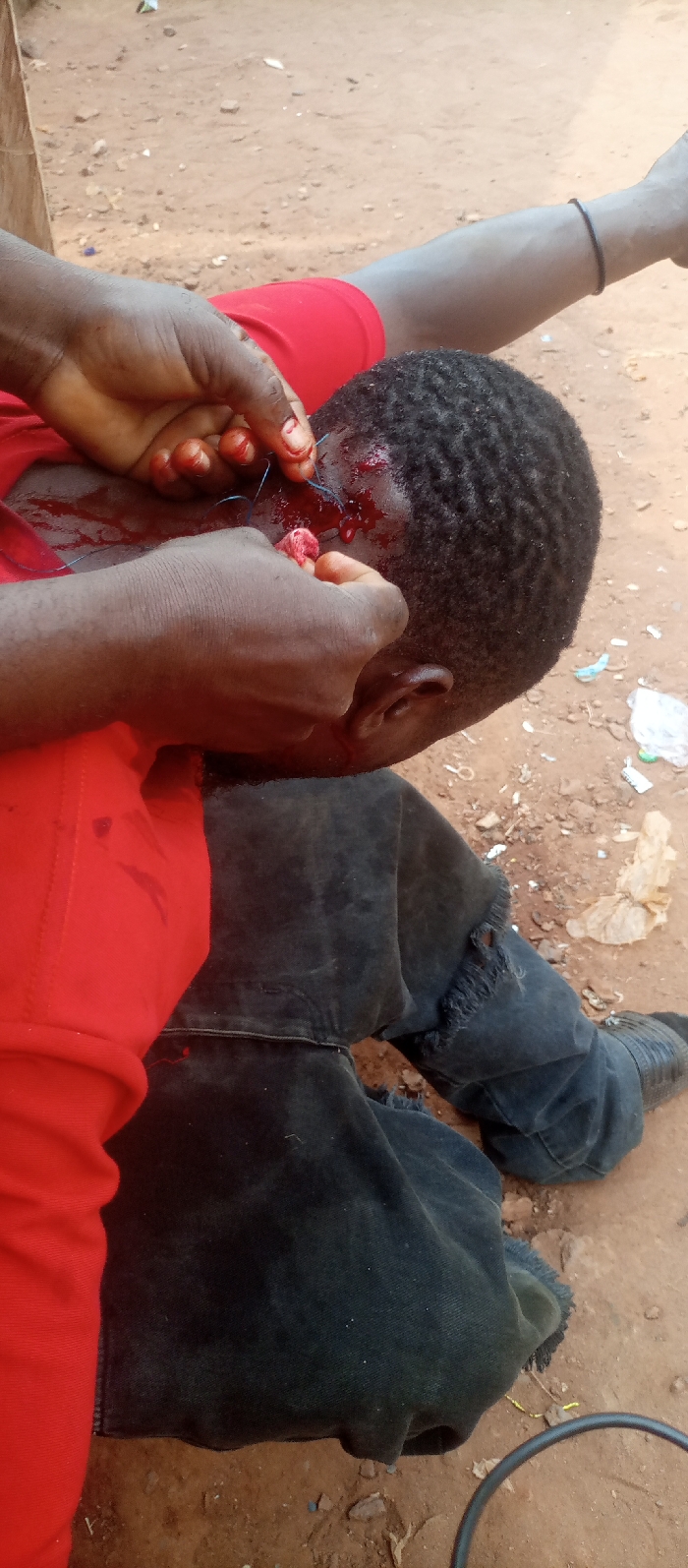 In Amokwue-Affa, Nigeria, an individual with dark skin and short, dark hair is depicted receiving sutures for a bleeding laceration located on the head, posterior to the ear. The wound is actively being closed with blue thread by the bare, blood-stained hands of a second individual. The injured person is clad in a red upper garment and dark, worn trousers, and appears to be seated or reclined on an unpaved, reddish-brown dirt ground scattered with small rocks and miscellaneous debris, including plastic wrappers. The individual performing the suturing is also wearing a red garment, visible on their arm. A black cable or hose is partially visible in the lower right foreground.