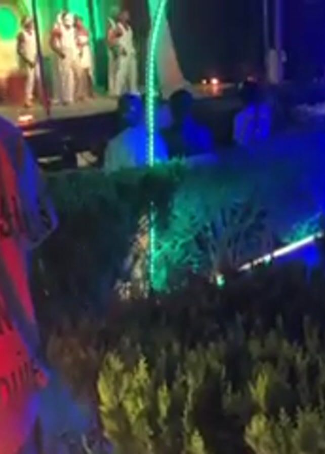 At an outdoor nighttime event, a group of dancers dressed in white outfits are performing on a stage illuminated with bright lights. Seated in front of the stage, an audience watches the performance. Decorative lighting in blue, green, and red surrounds the event space, accentuating the festive atmosphere. The foreground shows bushes and foliage illuminated by the decorative lighting. One individual, wearing a Louis Vuitton shirt, is captured from the back, appearing to observe the performance.