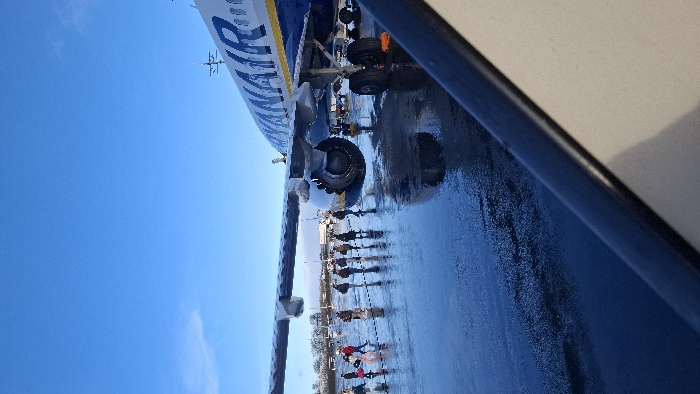 A Ryanair airplane is parked on a wet tarmac, with its landing gear visible. People are lined up to board or disembark. The scene is outdoors, with a clear blue sky in the background. The image is taken from a low angle, emphasizing the size of the plane. Parts of a wall are visible on the side.