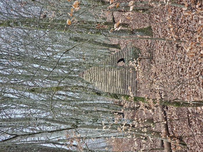A narrow stone path winds through a forest, heavily layered with fallen leaves. Bare trees with lichen-covered branches form a dense canopy, filtering light onto the path. A dark object sits on the path. The scene conveys a sense of quiet and seclusion in a woodland setting.