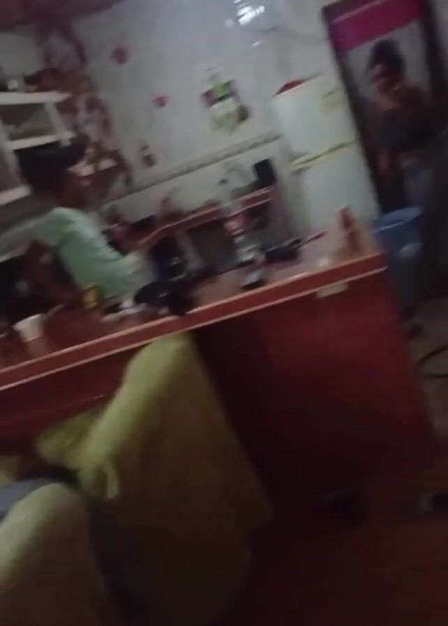 interior of a room, likely a kitchen or combined living space. A woman wearing a black top and gray leggings stands near a doorway, while a child in a light-colored shirt is seated at a red-tiled counter. The room has tiled floors and walls. A refrigerator is visible in the background, along with various household items scattered on the counter and shelves. There is a power cord running across the floor. The video seems to be taken from a low angle, possibly from a seated or reclining position.
