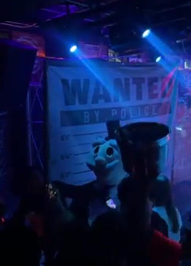 person in a club dressed as Rich Uncle Pennybags from the Monopoly board game. The person is wearing a black suit and top hat, standing in front of a backdrop that says "WANTED BY POLICE" with a height chart behind them. Another person stands beside them with a silver cup, which they raise in the air. The lighting is primarily blue. There are other people around but they are indistinct. The camera angle is from the floor, tilted up to the subject.