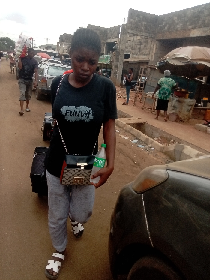 The scene depicts a bustling street in Nnewi, Nigeria, characterized by pedestrian traffic, market activity, and vehicles. In the foreground, a young adult female with braided hair, wearing a black t-shirt with "FUUVA" text, light grey sweatpants, and white sandals, walks forward, slightly downcast. She carries a small, multi-patterned shoulder bag with a gold chain strap and holds a plastic bottle of Sprite in her right hand. Behind her, a black wheeled suitcase is being pulled. To the immediate right, the front fender of a dark-colored vehicle is partially visible. In the midground to the left, a male pedestrian walks away from the camera, carrying a large white sack on his left shoulder. A silver station wagon is parked behind him on the dusty, reddish-brown unpaved road. Further down the street, other individuals are visible. To the right of the main subject, an open concrete drainage ditch runs parallel to the street. Beyond the ditch, market stalls with various goods are present. An individual in a patterned green top and dark skirt stands near a stall under a large, light-colored umbrella. Another person in a blue shirt stands near a metal structure. In the background, a row of multi-story concrete block buildings, some appearing unfinished or under construction, lines the street. The sky is overcast.