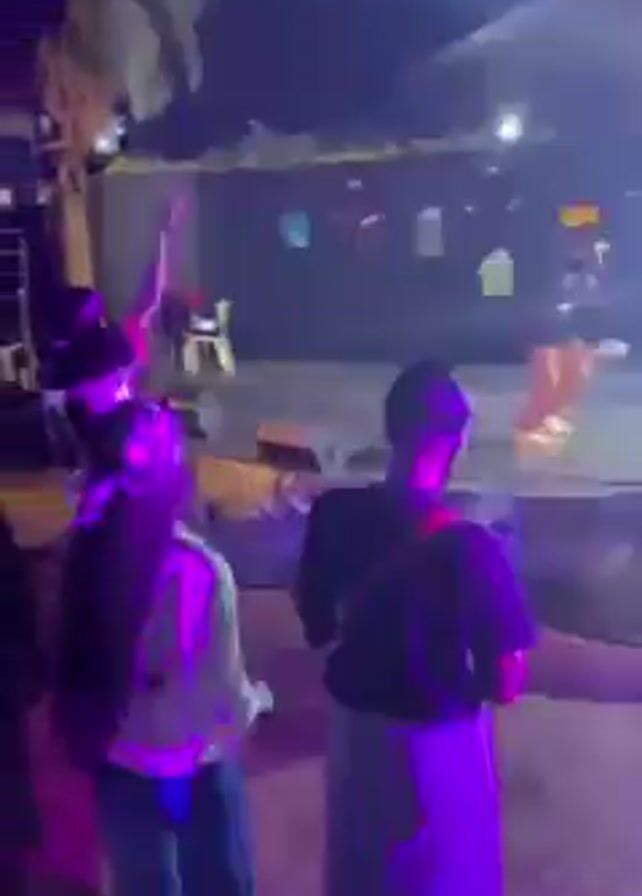 The video depicts an outdoor nighttime performance with a crowd. In the initial shot, a performer is on a small stage, illuminated by stage lights. People in the foreground are watching, some with raised hands, suggestive of enjoyment or participation. The camera then shifts to show a larger crowd gathered along a street or walkway. The crowd is diverse in age and dress, and they appear to be enjoying the music, with some individuals dancing and raising their hands. The lighting is varied, including streetlights and red and blue emergency lights, adding to the atmosphere. A traffic light is visible in the distance.