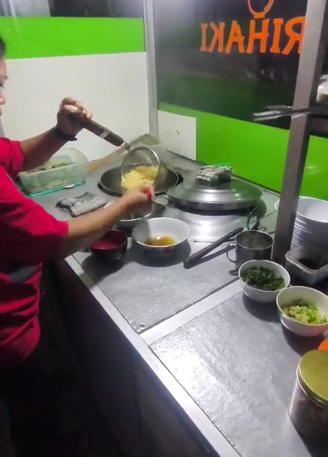 Here's a forensic description of the video: A person wearing a red shirt is seen preparing food at a food stall