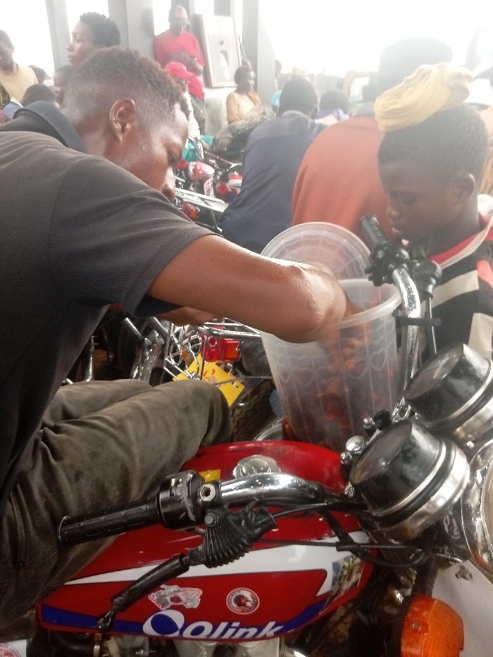 A man is seated on a red and white motorcycle, reaching into a clear plastic bucket filled with red objects, while a child with a yellow object on their head watches. The scene is crowded with other people and motorcycles. The man wears a dark shirt and brown pants. The motorcycle has a "Qolink" sticker on its side. A crowd of people is gathered in the background.