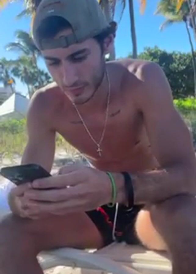 The video depicts a shirtless man sitting on a white lounge chair on a beach. He is wearing a backwards green baseball cap, black swimming trunks, and a silver chain with a cross pendant. He is looking down and using a black smartphone. There are palm trees and other greenery visible in the background, along with a clear blue sky. Sand is visible around the base of the lounge chair.