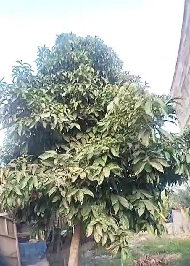 tree with broad, green leaves, some of which have yellow spots or markings