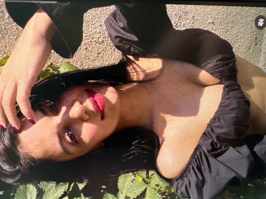 A young adult female is depicted in a frontal, chest-up portrait in an outdoor setting in Parakar, Armenia. She has long, dark hair and is wearing a black off-the-shoulder crop top with gathered fabric. Her right hand, featuring red nail polish, is raised to her forehead, partially obscuring the upper left side of her face (viewer's right). Her lips are painted with bright pink lipstick, and she displays a slight smile. Direct sunlight illuminates the scene, casting a prominent shadow across her upper chest and the left side of her face. The background on the left consists of green foliage, while the right side features a light-colored, textured wall.