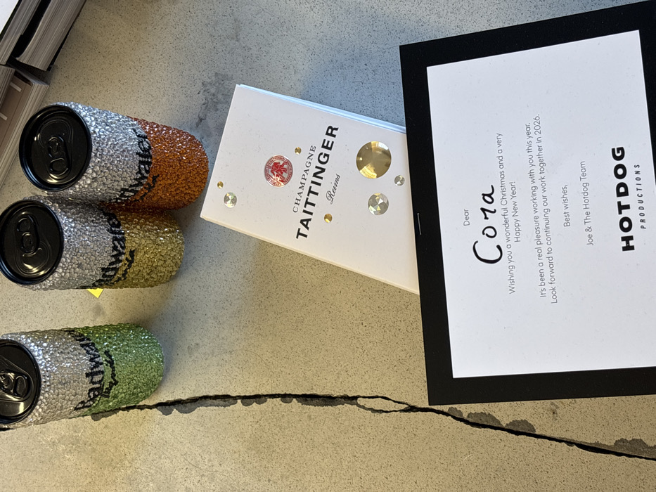 The image displays a collection of gift items arranged on a light grey, concrete-like surface, which features a prominent dark fissure running vertically on the left side. Three cylindrical beverage cans, each with a black pull-tab top, are visible. These cans are covered in a textured, possibly rhinestone or glitter, finish; the leftmost is silver and green, the middle is silver and gold, and the rightmost is silver and orange. The word "Badwater" is partially visible on the green and gold cans. Behind these items, a white box, standing upright, is partially visible, bearing the inscription "CHAMPAGNE TAITTINGER Reims" and decorated with circular metallic and holographic embellishments. In the foreground, a black-framed white greeting card is laid flat. The card is addressed "Dear Cora" in a script font and contains the text: "Wishing you a wonderful Christmas and a very Happy New Year! It's been a real pleasure working with you this year. Look forward to continuing our work together in 2026. Best wishes, Joe & The Hotdog Team," with the "HOTDOG PRODUCTIONS" logo at the bottom. The background to the top right consists of blurred stacks, possibly books or papers. Based on the sender "HOTDOG PRODUCTIONS" listed on the greeting card, the scene is likely situated within a commercial or office environment associated with this production company in London, United Kingdom, presenting a holiday gift to an individual named Cora.