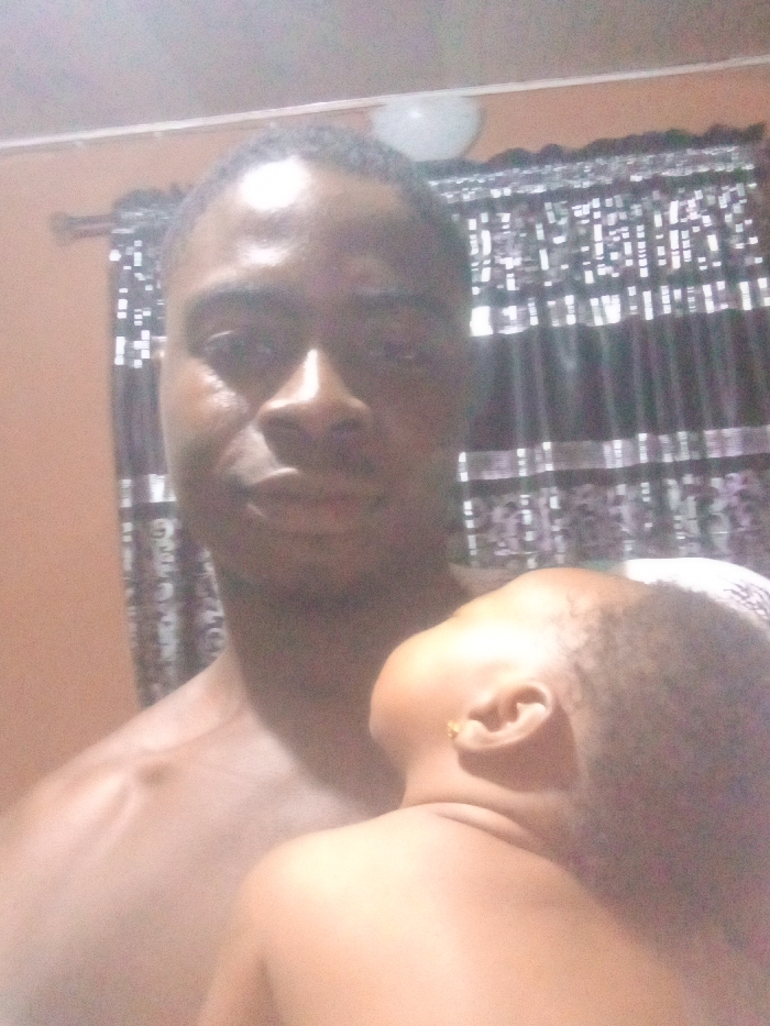 A shirtless man holds a baby. The man is dark-skinned with short hair and is looking towards the camera. The baby is lying sideways against the man's chest, facing to the right. The baby has a gold earring. The background consists of orange-colored walls and curtains that are partially covering a window. A small white balloon is hanging from the ceiling. The image appears to be taken in a dimly lit room.