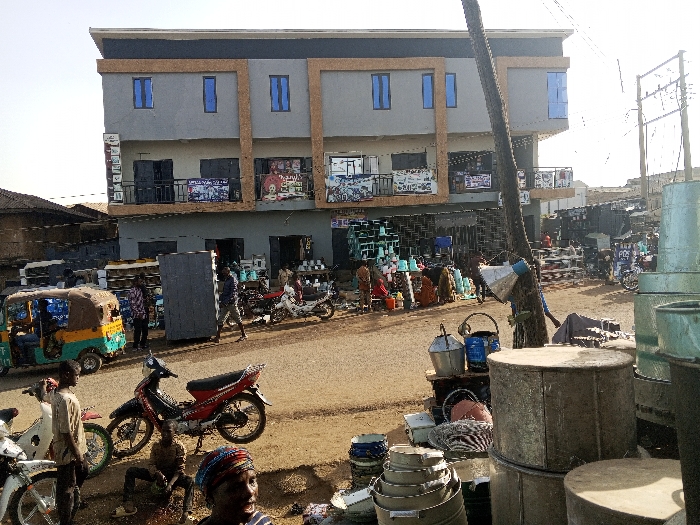 This image captures an outdoor market scene in Jos, Nigeria, characterized by commercial activity and urban infrastructure