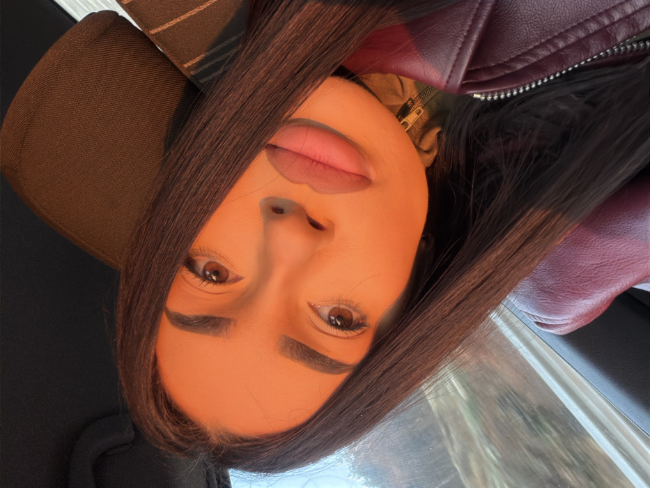 A single female individual is depicted in a close-up, angled photograph taken inside a vehicle