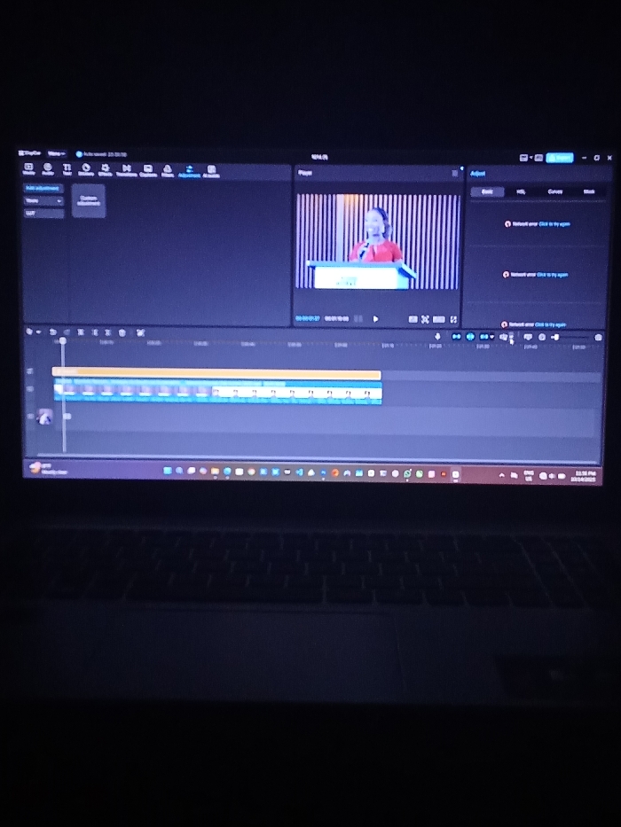 The image displays a dark-toned laptop in a low-light environment, with its screen showing a video editing software interface. The top-right panel of the software features a preview window displaying a female individual with dark hair, wearing a red shirt, speaking into a microphone while standing behind a light-colored podium marked with partially visible text, possibly "GREEN." The background behind her consists of vertical striped panels. Below the preview window is a timeline displaying multiple video and audio tracks, with a prominent yellow-orange segment and a blue track containing several segmented clips. Playback controls and timestamps are visible on the timeline. The software's interface also shows various editing tools, options, and multiple "Network error. Click to try again" messages in a side panel. The laptop's illuminated keyboard and trackpad are visible in the lower portion of the image. The Windows taskbar at the bottom of the screen displays the time "1:56 PM" and the date "10/24/2023." The scene is located in Unknown, Unknown.