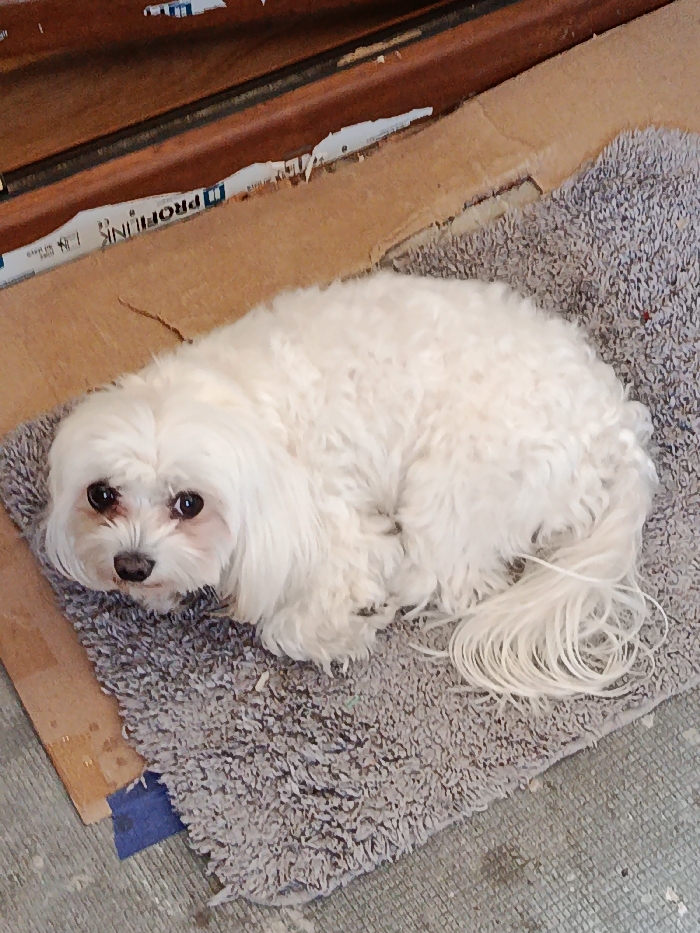 - "A small, white, long-haired canine, consistent with a Maltese breed, is observed resting in a curled position on a rectangular, shaggy grey rug" by FM-MudZ43, licensed under CC BY 4.0