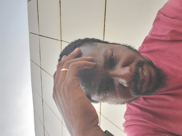 A medium-shot portrait captures an adult male, likely in Sabon Gari North, Nigeria, against a tiled wall and sky