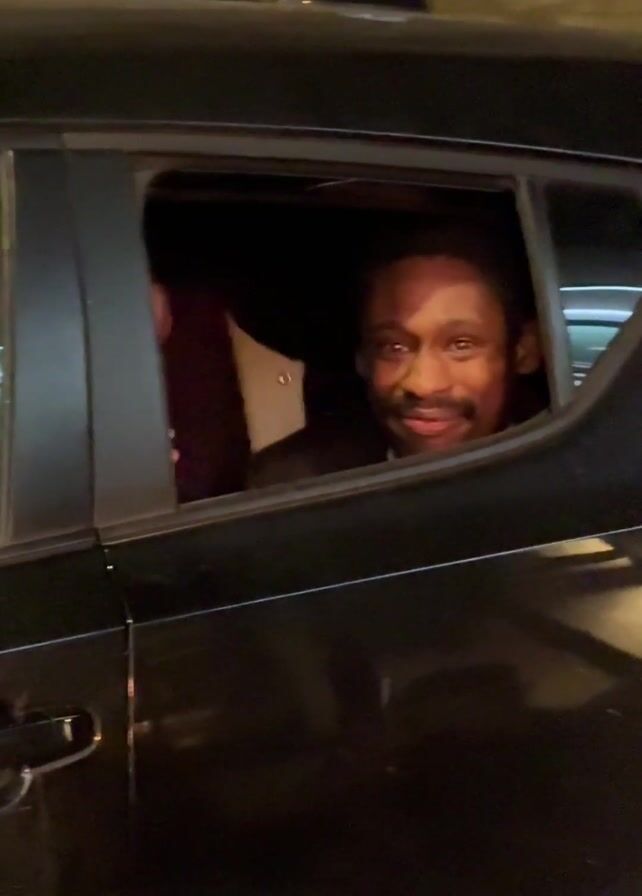 Two men are visible in a black car. One man, with dark hair and a beard, is partially visible behind the driver's side rear window. The driver, also a man with dark hair, is looking at the camera and holding what appears to be a cigarette out of the window. The car is parked on a street. A brick wall is visible in the background. The driver briefly opens his mouth and appears to say something while looking at the camera.