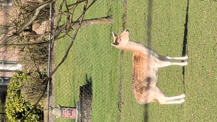 - "A single fallow deer, characterized by its light brown coat with white spots and a pale underside, stands in profile on a green grassy field, facing towards the right" by FM-btFon2, licensed under CC BY 4.0
