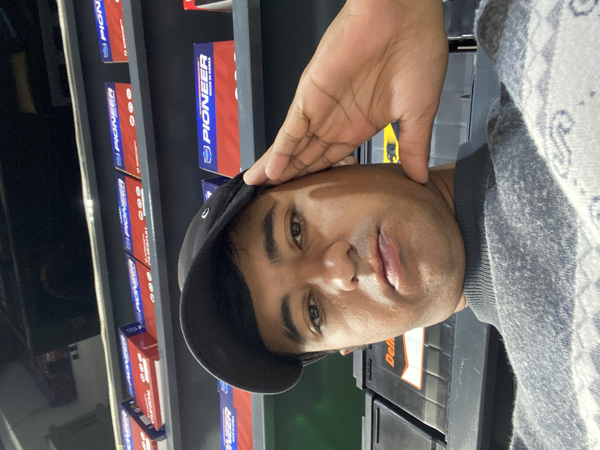 An adult male is depicted in a close-up, low-angle shot within an indoor commercial setting, likely an automotive battery retail store. He wears a black baseball cap and a grey turtleneck sweater with a lighter patterned element on the chest. His left hand is raised, palm facing forward, covering the left side of his head from the temple to the ear. His eyes are open and directed at the camera, with his lips slightly parted. Behind him, dark shelving units display numerous automotive batteries. Several red and blue boxes prominently feature the "PIONEER" brand logo and "MADE IN KOREA" text. Other black batteries with "Delkor" branding are partially visible on lower shelves. The specific location within Bukhara, Uzbekistan, is not discernible from the visual information presented.