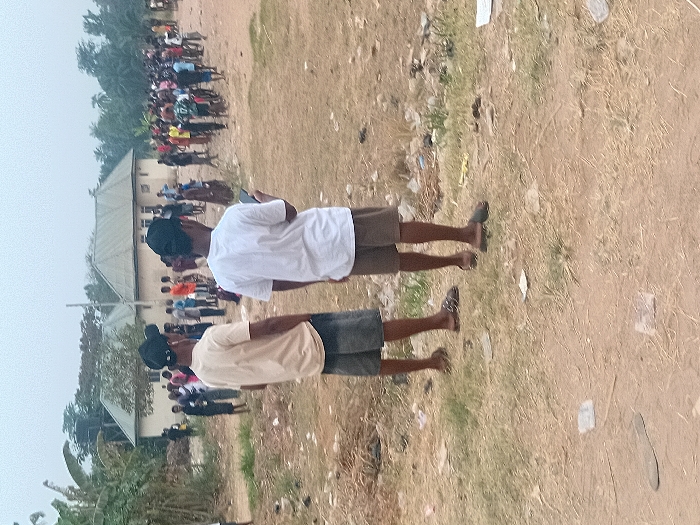 Two young men, one in a white shirt and one in a beige shirt, both wearing shorts and caps, stand facing away from the camera. Behind them is a gathering of people in an open, grassy area. A building is visible in the background, with trees to the left. Litter is scattered on the ground. The photo appears to be taken from a slightly elevated position.