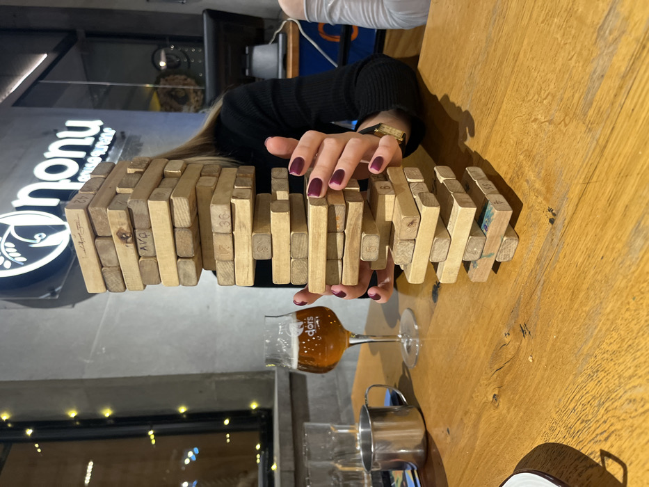A Jenga tower stands tall on a wooden table, supported by two hands with burgundy nails. A beer glass with amber liquid sits near the base of the tower. A metal mug and a white mug rest on the table's edge. A woman with a black sweater and gold watch holds the Jenga tower. A window and a lit sign with "nononu" are visible in the background.
