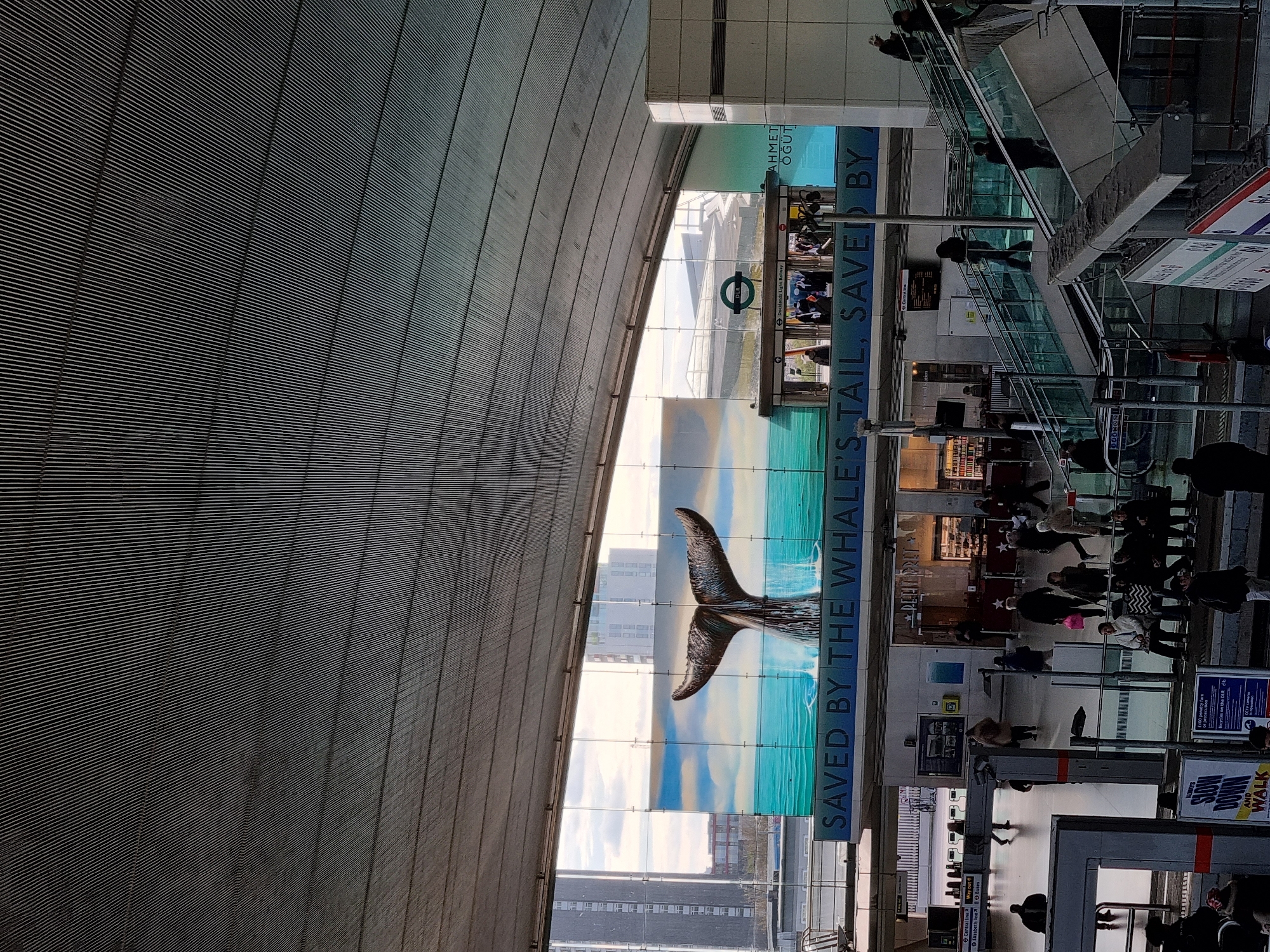 This image captures the interior of Canary Wharf DLR (Docklands Light Railway) station in London, United Kingdom. The scene is characterized by a vast, modern architectural space featuring a high, arched ceiling constructed from corrugated metallic panels. Large floor-to-ceiling glass windows form the rear wall, revealing tall urban buildings and a cloudy daytime sky outside. Dominating the upper section of the background is a large digital display screen showing a whale's tail emerging from turquoise water under a blue sky. Below this image, partially visible white text reads "SAVED BY THE WHALE'S TAIL, SAVED BY". Beneath the display and centered in the background is a black circular London Underground roundel with "DLR" in white, marking the Docklands Light Railway entrance. The station's lower levels feature multiple platforms, walkways, and commercial units, including a "Pret A Manger" visible on the left. Several escalators and staircases connect these levels; a prominent bank of escalators is visible on the right, ascending. Numerous individuals are present throughout the station, engaged in various activities: walking across concourses, ascending the escalators, waiting, or seated on benches. Wayfinding signage, including directions for "Central line," "Way out," and "Buses," is visible, alongside informational posters. The station is brightly illuminated by both natural light filtering through the large windows and overhead artificial lighting.