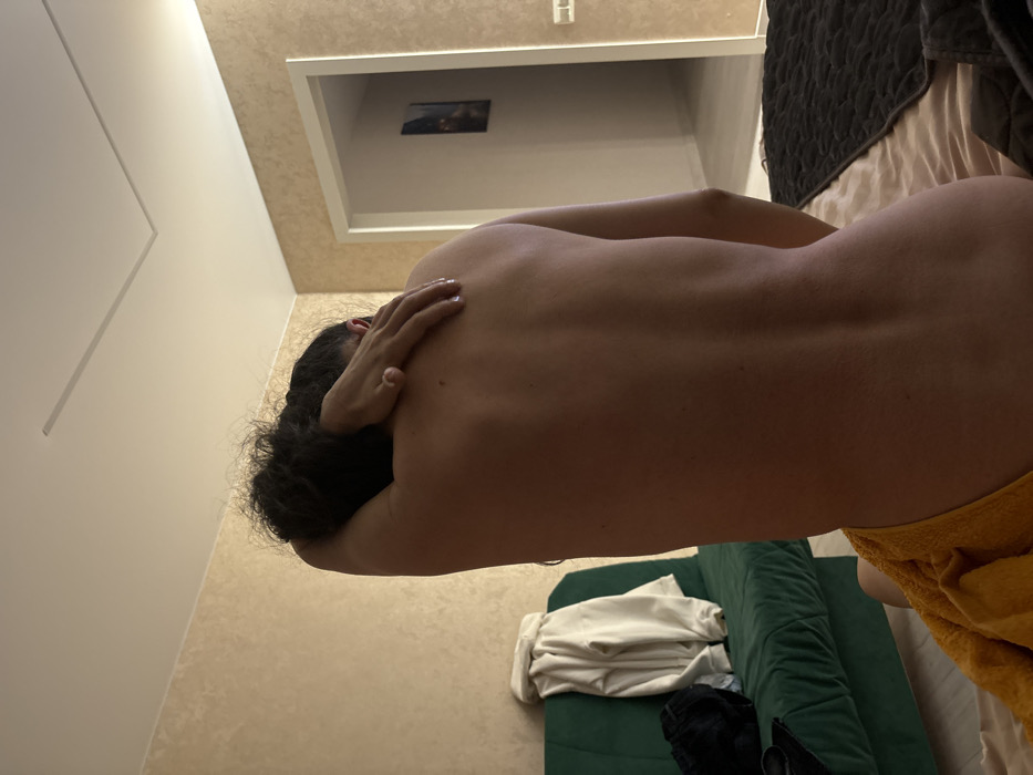 A partially nude person is lying on a bed, covered with a yellow towel. Their back is facing the camera, with one hand resting on their shoulder. The person has dark, curly hair. In the background, there's a green sofa with a white garment and black shoes. The room has light beige walls and a rectangular light fixture on the ceiling.