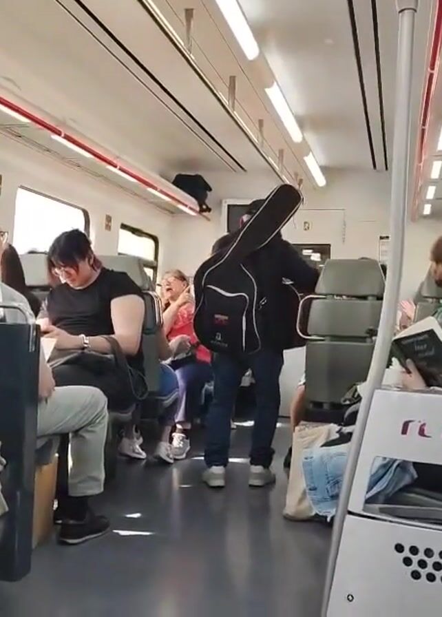 man playing a guitar on a moving train. The train is clean and brightly lit. The man is wearing a black jacket, jeans, and a baseball cap, and carrying a guitar case on his back. He smiles at the camera while playing the guitar. Several passengers are seated in the train, some looking at their phones, some reading, and one clapping.