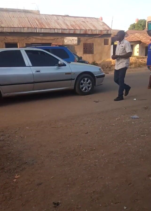 The video pans from a silver sedan parked on a dirt road alongside a blue hatchback, past a person walking towards the silver sedan