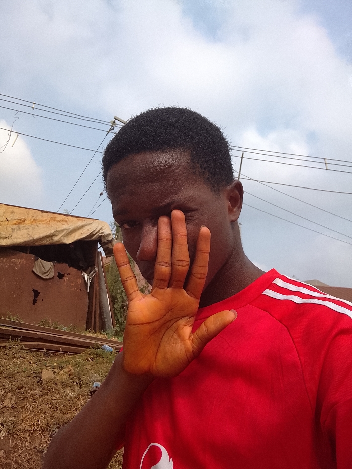 The image presents a single male individual positioned in an outdoor setting within the city of Onitsha, Nigeria. The subject, a dark-skinned male with short, dark hair, wears a red short-sleeved shirt with three white stripes on the right shoulder and a partial white circular logo on the lower left chest. His right hand is raised, palm open and facing the camera, obscuring his left eye, nose, and part of his left cheek. His right eye is visible and directed towards the viewer. The ground in the foreground consists of dry, reddish-brown soil with minimal vegetation. In the background to the subject's left, a rudimentary structure with dark reddish-brown walls is visible, topped by a light-colored, possibly fabric or tarpaulin, roof from which clothing is suspended. Several elongated, dark-colored objects, possibly metal beams or planks, are stacked on the ground in front of this structure. Overhead, multiple black utility lines are visible against a partly cloudy sky.