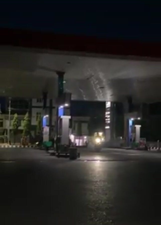 At night, a gasoline station is dimly lit by overhead lighting, while a motorcycle approaches the camera. Buildings and vegetation are visible behind the station. The sky is dark.