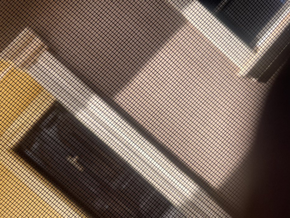 The scene, located in Markurdi, Nigeria, depicts an outdoor environment viewed through a fine, dark-colored mesh screen that occupies the entire foreground. Strong natural light produces distinct diagonal bands of illumination and shadow across the mesh and the visible background elements. A prominent, wide, bright diagonal stripe of sunlight traverses the image from the upper-left to the lower-right. In the upper-left quadrant, a dark, rectangular shadow is cast, visible over the mesh and a textured background surface. This background surface displays a yellow-gold coloration in the upper portion, gradually transitioning to a lighter beige-tan hue towards the lower right. An indistinct, dark, irregular object partially obstructs the lower-left corner of the frame, positioned in front of the mesh. No people, discernible actions, or interactions are present within the captured view.