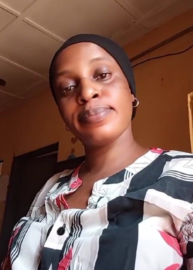 A woman with brown skin, wearing a black head covering and a button-down blouse with black, white, and red floral patterns, is looking directly at the camera. She has on hoop earrings and light-colored lipstick. She is standing in a room with a beige wall and a white tiled ceiling. There is a closed dark brown door visible in the background. She looks down and then back at the camera, and smiles slightly.