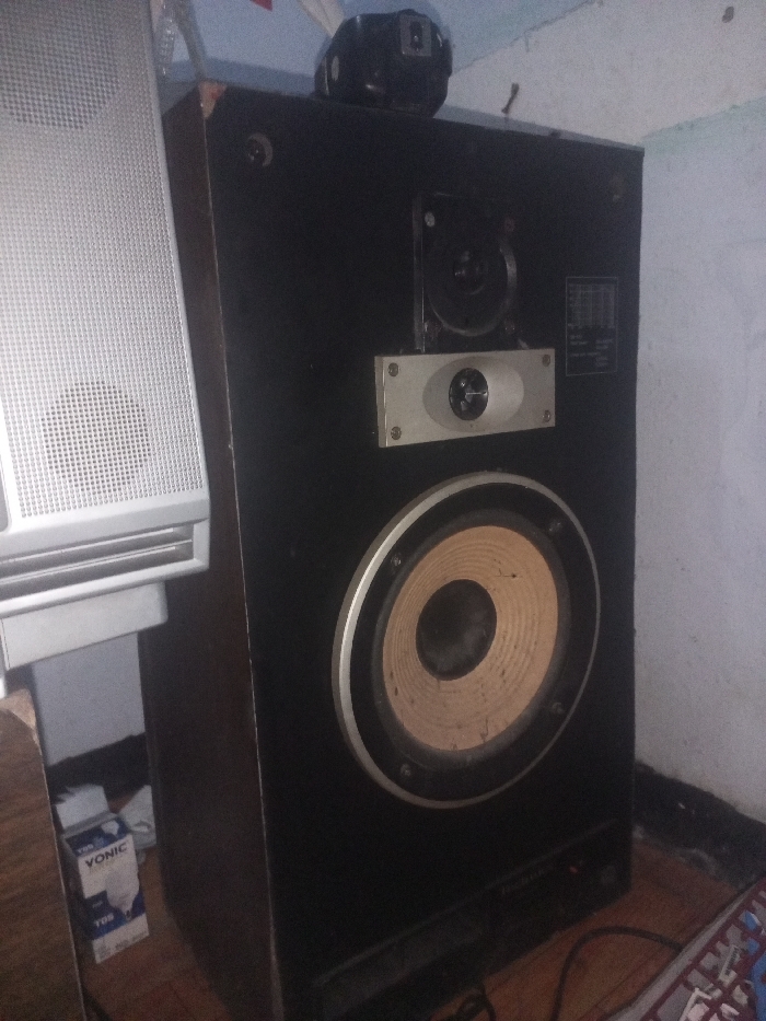 The scene, located indoors in Ciherang, Indonesia, primarily features electronic audio equipment. A dark-colored, rectangular floor-standing loudspeaker is positioned centrally on the right, resting on a wooden floor. The loudspeaker's front face displays a large, circular woofer with a light brown cone and a silver-metallic surround at the bottom. Above the woofer, a rectangular silver-metallic panel with a central dark knob or driver is present, with a smaller circular tweeter above it. A vertical data plate with graphical elements is visible on the upper right side of the speaker's front. A small, dark-colored electronic device, possibly a camera, rests on the top surface of the loudspeaker. The top-left corner of the loudspeaker cabinet exhibits damage, revealing underlying material. To the immediate left, a silver-colored electronic component, likely another speaker with a perforated grille, is partially visible. On the wooden floor adjacent to the main loudspeaker, a white box labeled "VONIC" and "TDS" is discernible. Electrical cabling extends from the base of the primary loudspeaker onto the wooden floor. A segment of a patterned mat, featuring blue, white, and red elements, is visible on the floor in the lower right corner. The background consists of light-colored walls.