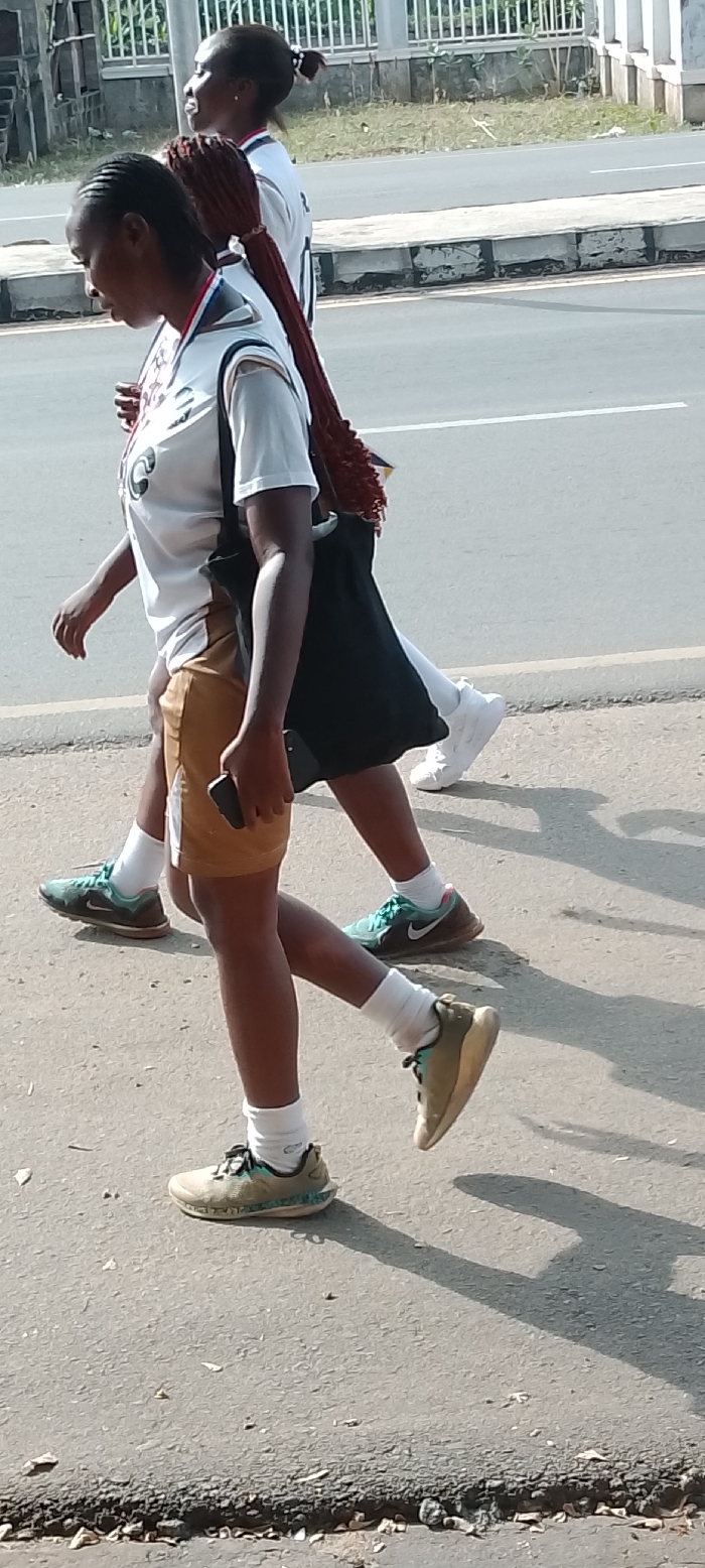 The scene depicts three individuals walking on a paved surface adjacent to a roadway in Lokoja, Nigeria. The lighting indicates direct sunlight, casting distinct shadows on the pavement. In the foreground, an individual, identified as Subject A, walks in profile, facing left. Subject A possesses a dark complexion and wears their hair in cornrows, with a prominent, long, reddish-brown braided extension extending down their back. They are dressed in a white short-sleeved t-shirt, light brown shorts, white socks, and olive-green athletic shoes featuring a light blue-green accent on the sole. Subject A carries a black shoulder bag on their right side and holds a black smartphone in their right hand. Their left foot is elevated, indicating a mid-stride movement. Immediately behind Subject A is Subject B, also walking in profile, facing left. Subject B has a dark complexion, with dark hair pulled back into a small bun or ponytail. They wear a white short-sleeved t-shirt, white socks, and athletic shoes with a turquoise-teal and brown color scheme, displaying a white Nike swoosh on the visible right shoe. Subject B's left foot is planted on the ground. Partially visible behind Subject B is Subject C, of whom only a lower leg and a white athletic shoe are discernible. Subject C's right foot is planted on the ground, suggesting forward motion. The walking surface is gray asphalt, showing minor wear. To the right of the subjects, a light gray asphalt roadway is visible, delineated by a white line and separated from the walking path by a concrete curb. In the background, a light-colored fence or wall with vertical bars is present, behind which some green vegetation is visible.