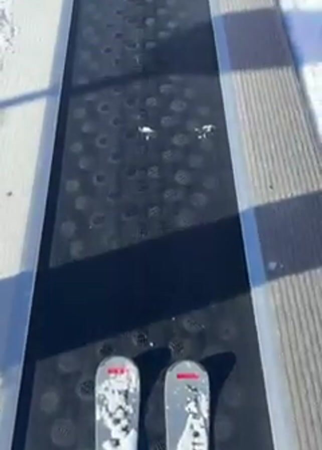 person wearing skis, standing on a moving conveyor belt lift at a ski resort