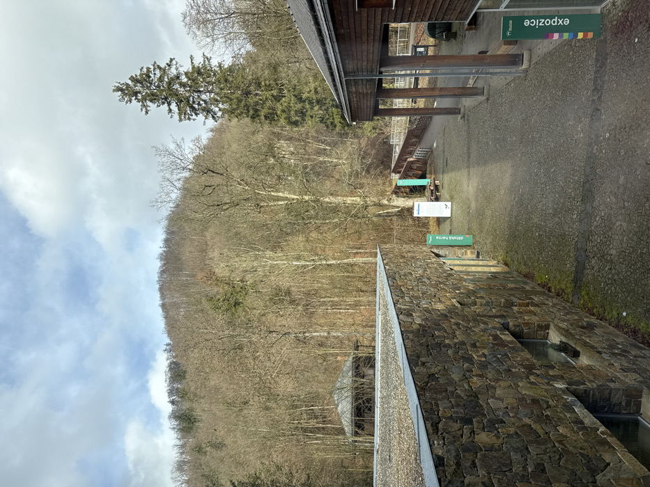 - "An outdoor scene in Vavřinec, Czechia, depicts a paved courtyard area flanked by two buildings, set against a backdrop of a dense, bare deciduous forest covering a hillside under a partly cloudy sky" by FM-nRr0I2, licensed under CC BY 4.0