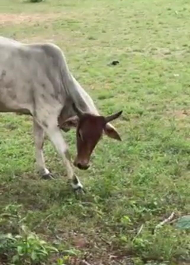- "A light-colored cow with a brown head stands in a grassy field, scratches its leg, looks at the camera, and then runs" by FM-nbXiU2, licensed under CC BY 4.0