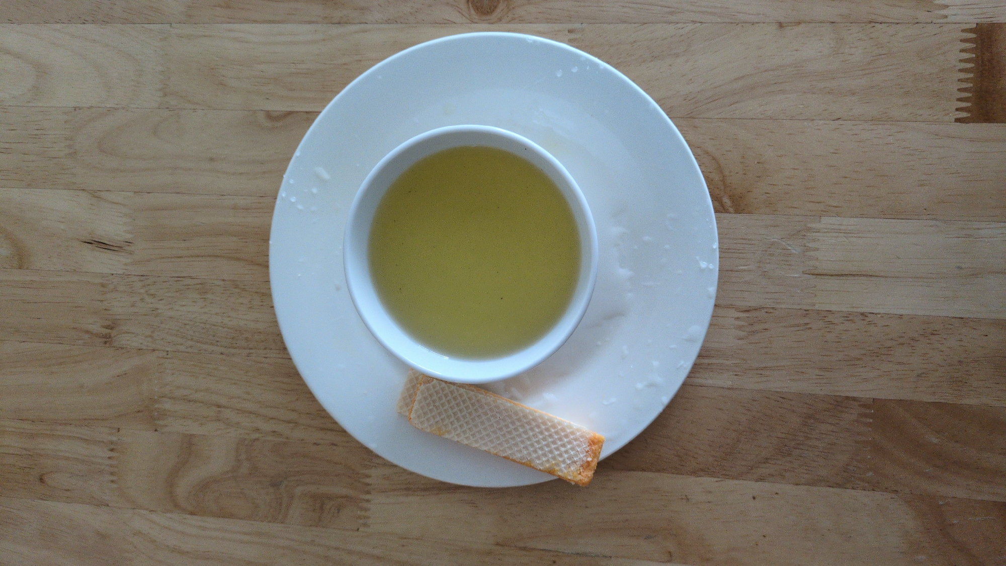 A top-down shot on a wooden surface, showing a white bowl of yellow liquid on a white plate, with a wafer cookie resting at the bottom of the plate