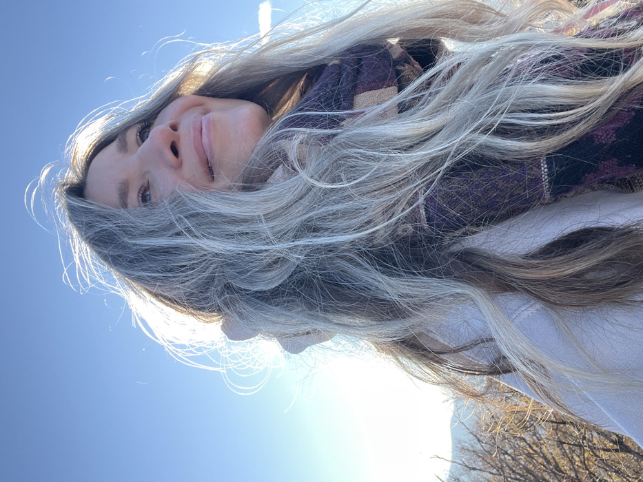 A female subject is depicted outdoors in a sunlit, upward-angled mid-shot. Her head is turned slightly to the viewer's right, and her face is angled upward, displaying a subtle smile with slightly parted lips. Her long, wavy, light-colored hair is backlighted by the sun, creating a bright halo and highlighting individual strands. She wears a light-toned garment and a checkered scarf in shades of purple, brown, and cream around her neck. The upper background features a clear blue sky, with the bright sun positioned out of frame to the left, causing backlighting. A small, faint cloud is visible in the upper right. The lower background shows a blurred landscape of distant, bare-branched vegetation and hills. The location is Prčanj, Montenegro.
