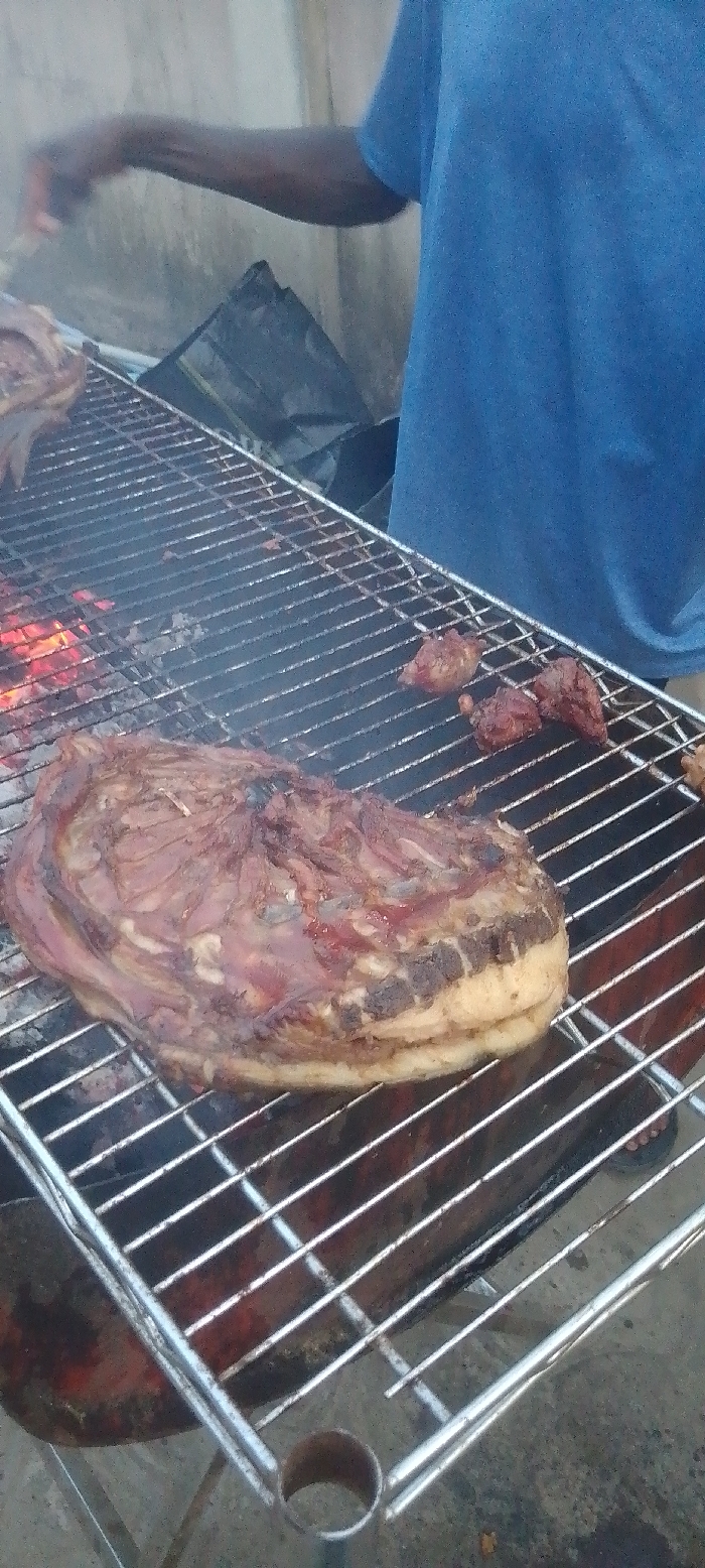 The image depicts an outdoor grilling operation. The specific location within Lekki, Nigeria, cannot be determined from the visual information, but the environment suggests an informal or street-side setting. One individual, visible from the chest down, wears a blue short-sleeved shirt. Their dark-skinned right arm extends towards a metal grill grate. A large, oval-shaped piece of dark, cooked meat, possibly a rolled flank or similar cut, rests prominently on the grill grate in the lower center. Several smaller, reddish-brown pieces of meat are scattered on the grate to the upper right. Beneath the grill grate, red-hot coals are visible, indicating active heat for cooking. The grill itself is a metal structure with support legs. In the background, a light-colored, possibly concrete or stucco wall shows signs of wear and staining. A black plastic bag is folded and resting against the base of this wall, to the left of the individual's torso. A foot wearing a dark flip-flop is partially visible on the dark, uneven ground beneath the grill.