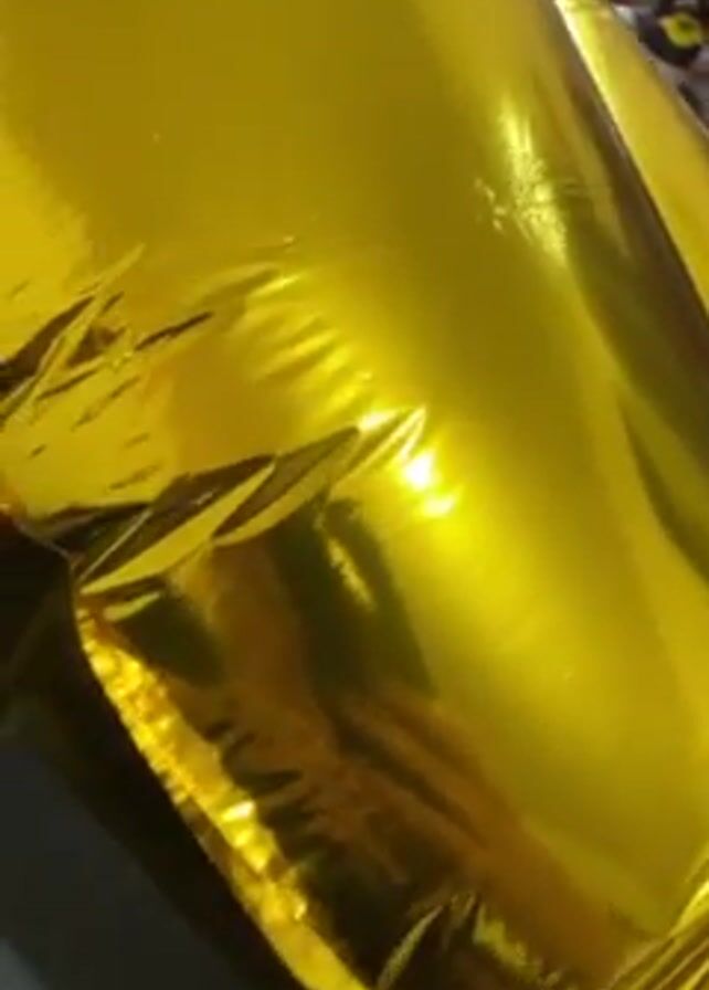 close-up of a gold foil balloon. The balloon is wrinkled and reflects light. The background is blurry.