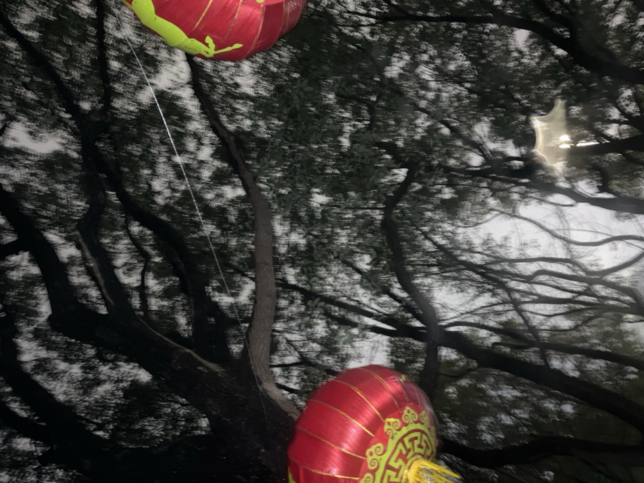 The image, captured in Yanqiao, China, presents an upward view into a dense tree canopy at dusk or night