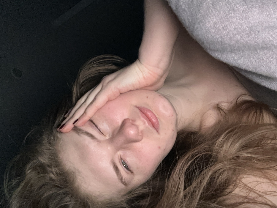 A close-up image displays a single individual, identified as a young adult female, positioned with her upper torso and head visible. Her light complexion presents several small blemishes on her chin and cheeks. Her hair is light brown, long, wavy, and appears disheveled, cascading over her left shoulder and chest. Her right hand, with dark nail polish on the fingernails, is pressed against the right side of her face, covering her right eye and temple area. Her left eye is partially open and squinting, while her mouth is slightly parted. A light grey, textured fabric is draped over her right shoulder and the lower right quadrant of the frame. The background is uniformly dark, providing no discernible environmental details. The image does not contain any visual information to determine its location within the city of Oktyabr'skii, Russia.