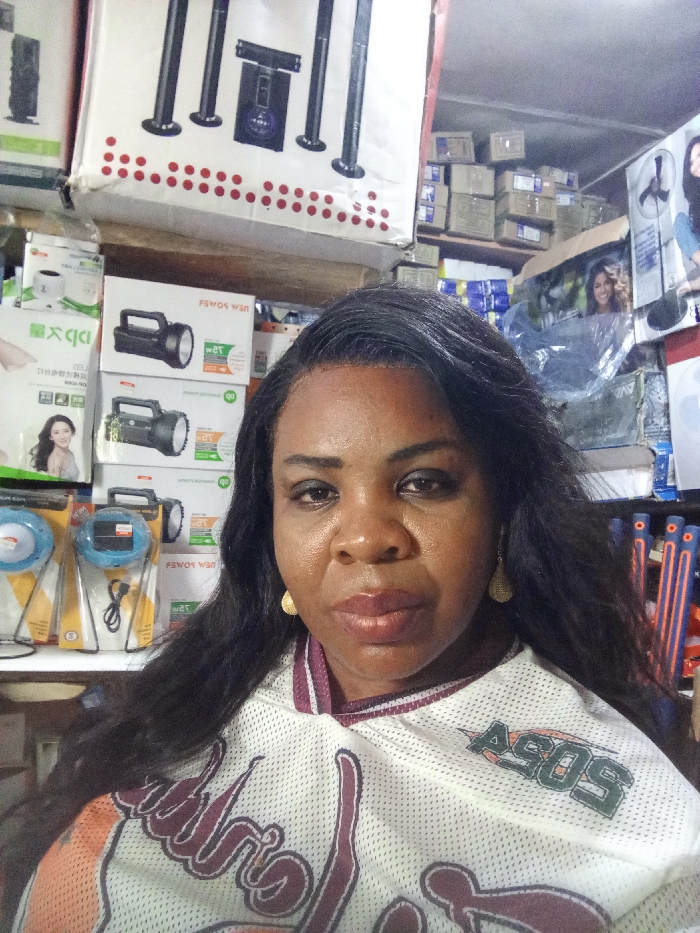 A medium close-up shot depicts a woman in an indoor commercial setting in Akodo, Nigeria