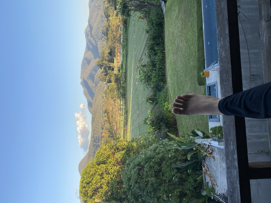 The image displays an elevated outdoor scene in Pai, Thailand. In the immediate foreground, a bare right foot and lower leg, clothed in dark trousers, are positioned horizontally, resting on a dark wooden railing that traverses the bottom of the frame. Below the railing, to the right, a segment of a dark-tiled swimming pool with visible steps is present. To the left, a concrete surface with scattered organic debris is partially visible. Beyond the railing, a manicured green lawn occupies the midground, transitioning into dense tropical foliage comprised of various shrubs and broader-leafed plants. Further into the midground, a substantial cultivated field with distinct parallel rows of green crops extends horizontally across the scene. Several leafy trees, some bearing white flowers, are interspersed throughout this area. The background is dominated by a range of verdant, forested mountains under a clear, light blue sky. A solitary, fluffy white cloud is situated above the mountains towards the left. The scene is illuminated by soft, natural daylight, indicative of either morning or late afternoon.