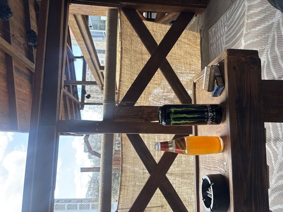The image depicts an outdoor terrace or cafe table in Sofia, Bulgaria, offering a partial view of the National Palace of Culture (NDK) complex. In the foreground, a dark-stained wooden table holds several items. From left to right: a black ashtray containing multiple cigarette butts and one unlit cigarette; an open glass bottle of Schweppes Tonic Water with orange liquid; a black Monster Energy "Mega" can with its distinctive green claw logo; and a stack of three cigarette packs, two of which are tan-colored "TERRA" brand, and one blue-colored pack. The floor beneath the table is covered by a light-colored, patterned rug. The midground features a rustic wooden railing structure, possibly part of a balcony or terrace enclosure. The horizontal top rail is wrapped in a thick, light brown rope. Below this, a coarse, light brown fabric screen, resembling burlap, is strung between the vertical wooden supports. Additional wooden beams and ceiling structures of the establishment are visible overhead. The background shows a bright, clear sky with scattered white clouds. A distinctive white, multi-tiered brutalist-style building, identifiable as part of the National Palace of Culture (NDK) in Sofia, is prominent on the left. Other distant urban structures and trees, some bare, are also visible. No individuals are present in the scene, but the arrangement of items on the table suggests recent or impending human activity.