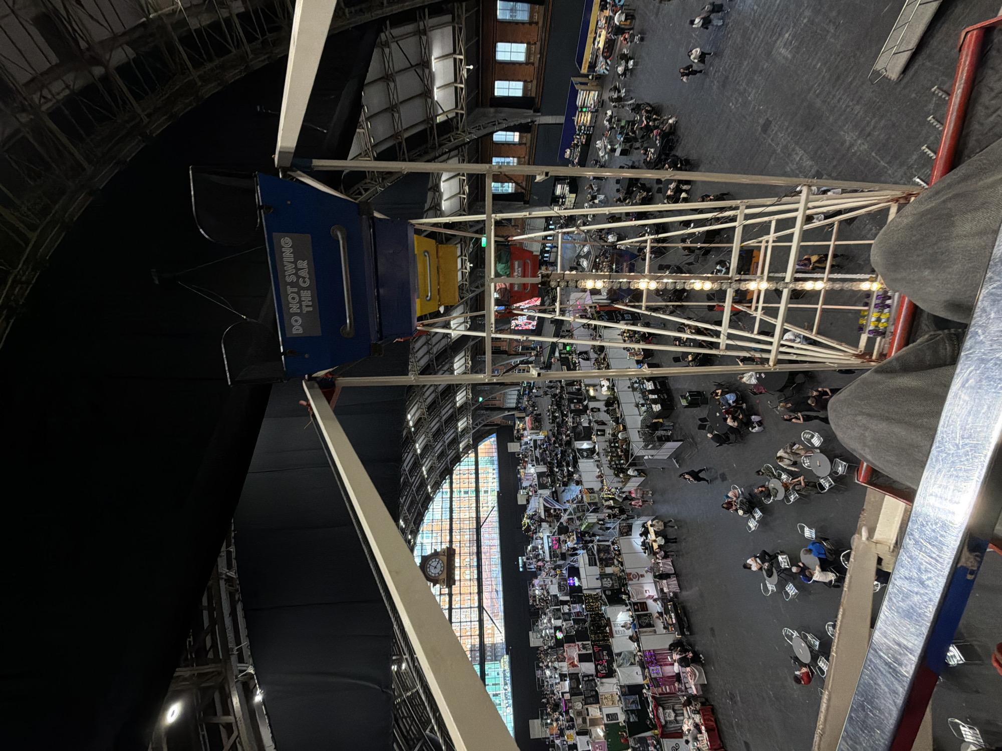 From a high vantage point, possibly a ferris wheel car, the image shows the interior of a large hall filled with exhibition stalls and attendees, likely a convention or trade show. The hall has a high, arched roof with visible structural supports. A large clock and stained glass window are visible at one end. Many people are gathered around tables and at the exhibition booths. The location is likely Manchester Central, United Kingdom, given the architectural style of the building. The image is rotated. A sign saying 'DO NOT SWING THE CAR' is visible on the ferris wheel car.